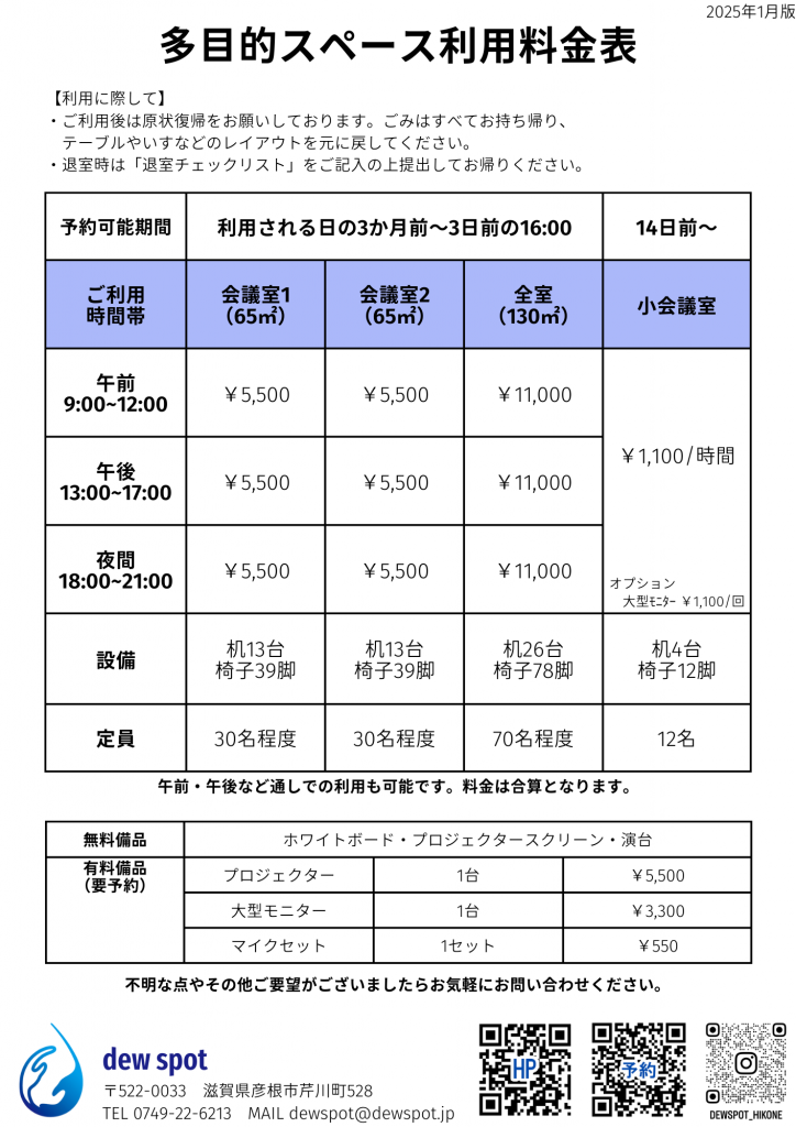 ※会議室(多目的スペース)のご利用ではプロジェクターなどが有料でご利用いただけます。