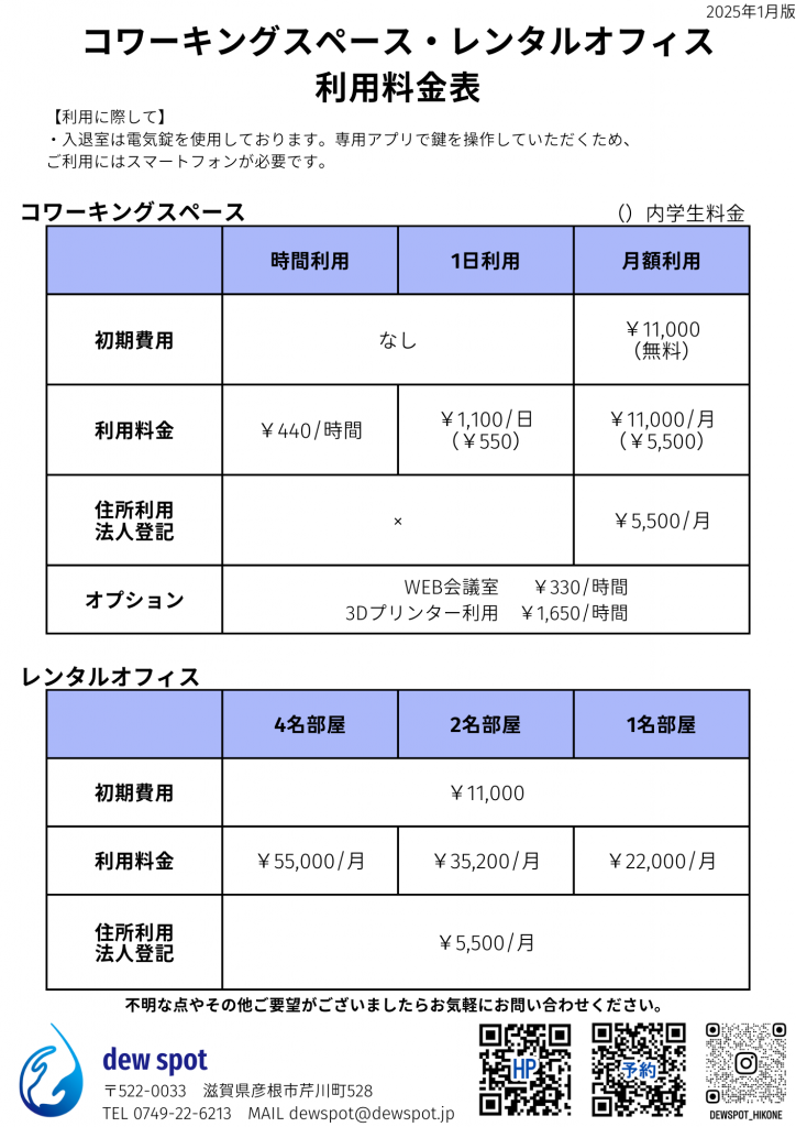 ※コワーキングスペースをご利用の場合は、コピー複合機、3Dプリンター、WEB会議室、小会議室が有料でご利用いただけます。