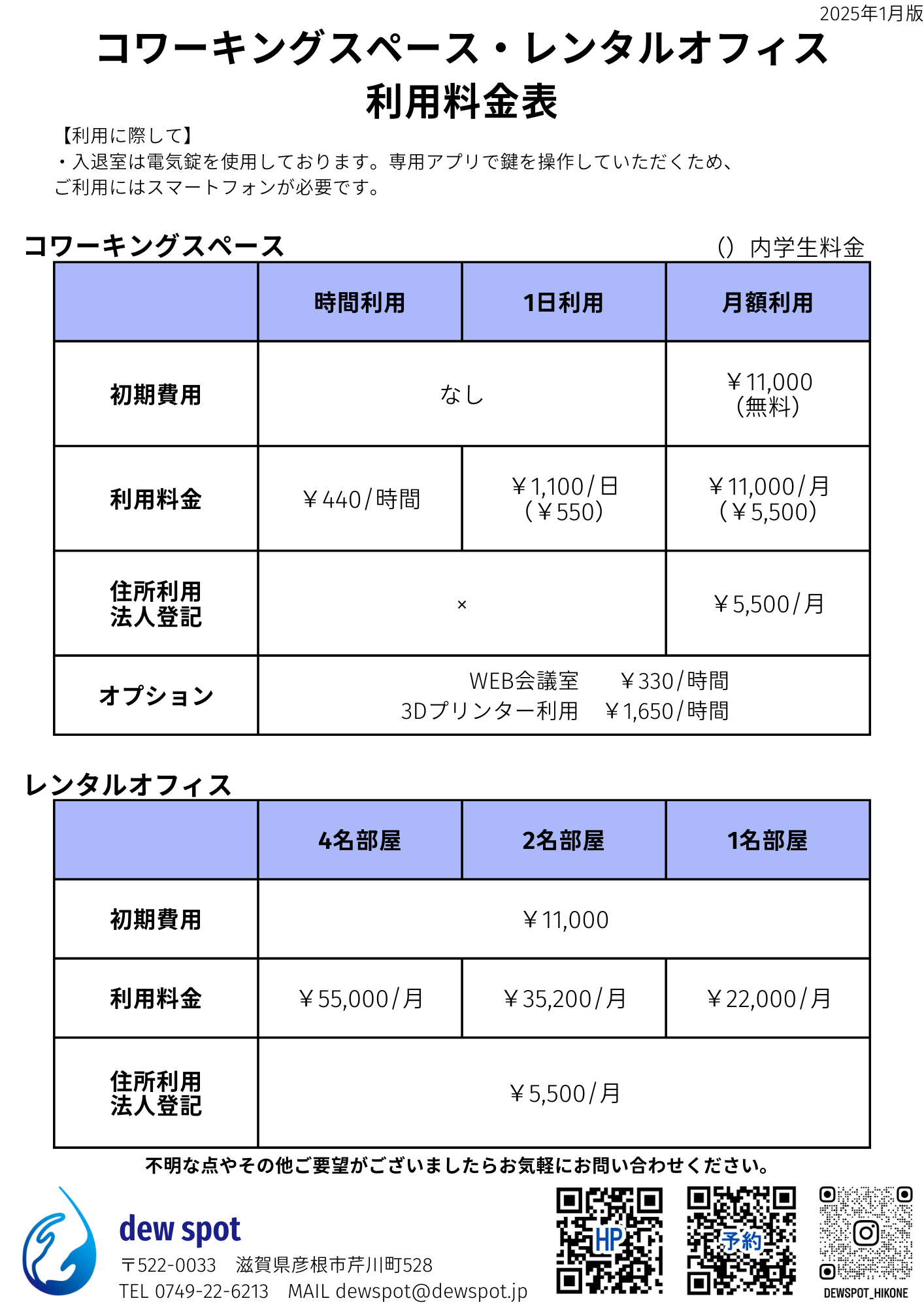 ※コワーキングスペースをご利用の場合は、コピー複合機、3Dプリンター、WEB会議室、小会議室が有料でご利用いただけます。